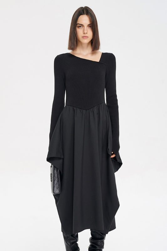 Knitted patchwork dress women's asymmetrical bevel neckline dress