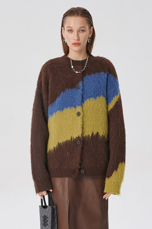 Wool blend knitted cardigan color block sweater slim fit top coat