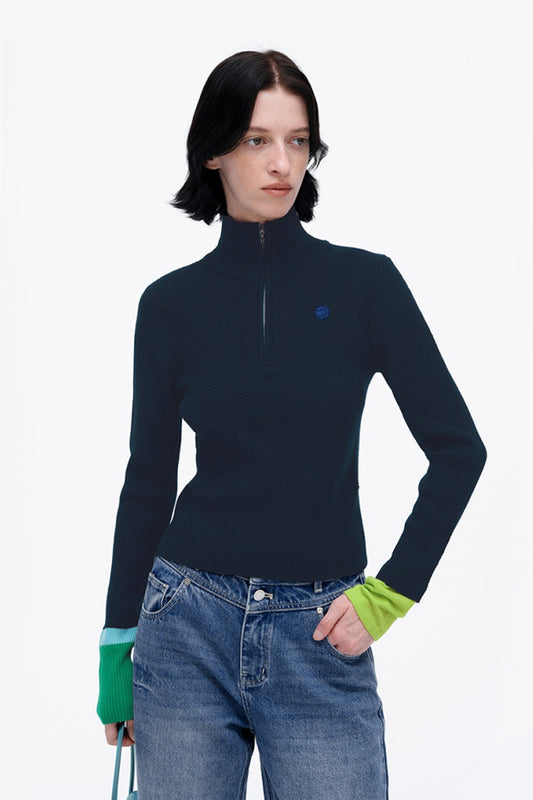 SELFWHO Wool Blend Half Turtleneck Zip-UP Sweater