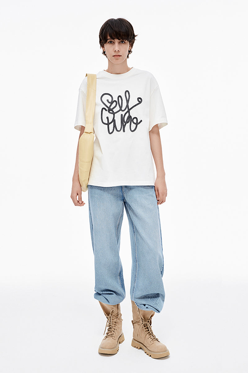 Loose fit T-shirt. The front piece has the brand logo artistically processed to create a three-dimensional embroidery effect. The embroidery thread is made of wool. The hem and cuffs are double-threaded, and the neckline is threaded for greater inclusiveness.