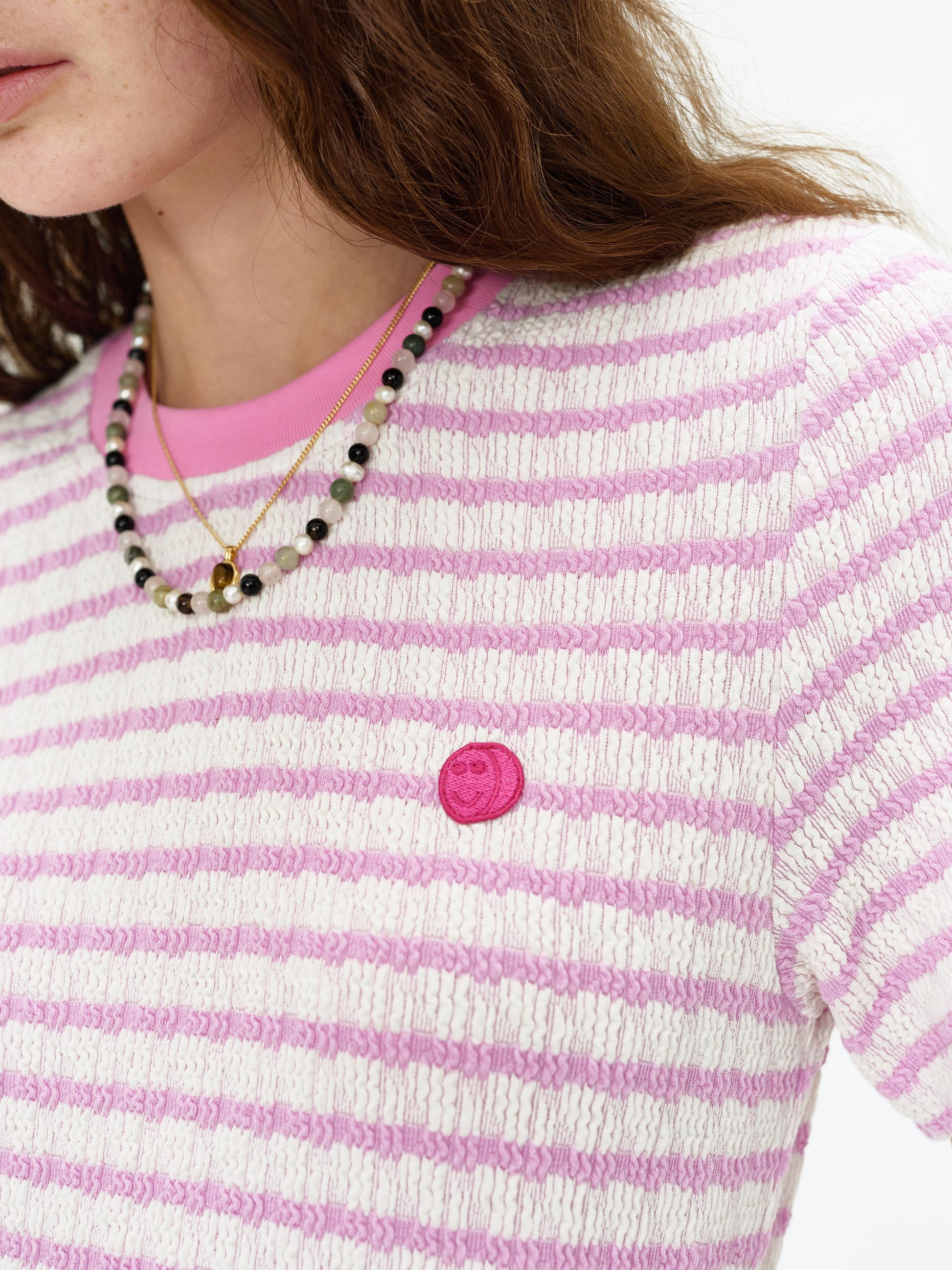 Design Description: This striped T-shirt features a classic crew neckline. The interlocking tones complement the overall design, and the ribbed neckline offers excellent stretch and shape retention. The brand's signature smiley face logo adds a playful detail. The blue and white stripes highlight the refreshing blue hue on a white background, creating a vibrant and practical look. The black and white stripes complement the classic white background with contrasting stripes, adding a touch of flair. The pink and white stripes create a vibrant, vibrant look for both spring and summer.
